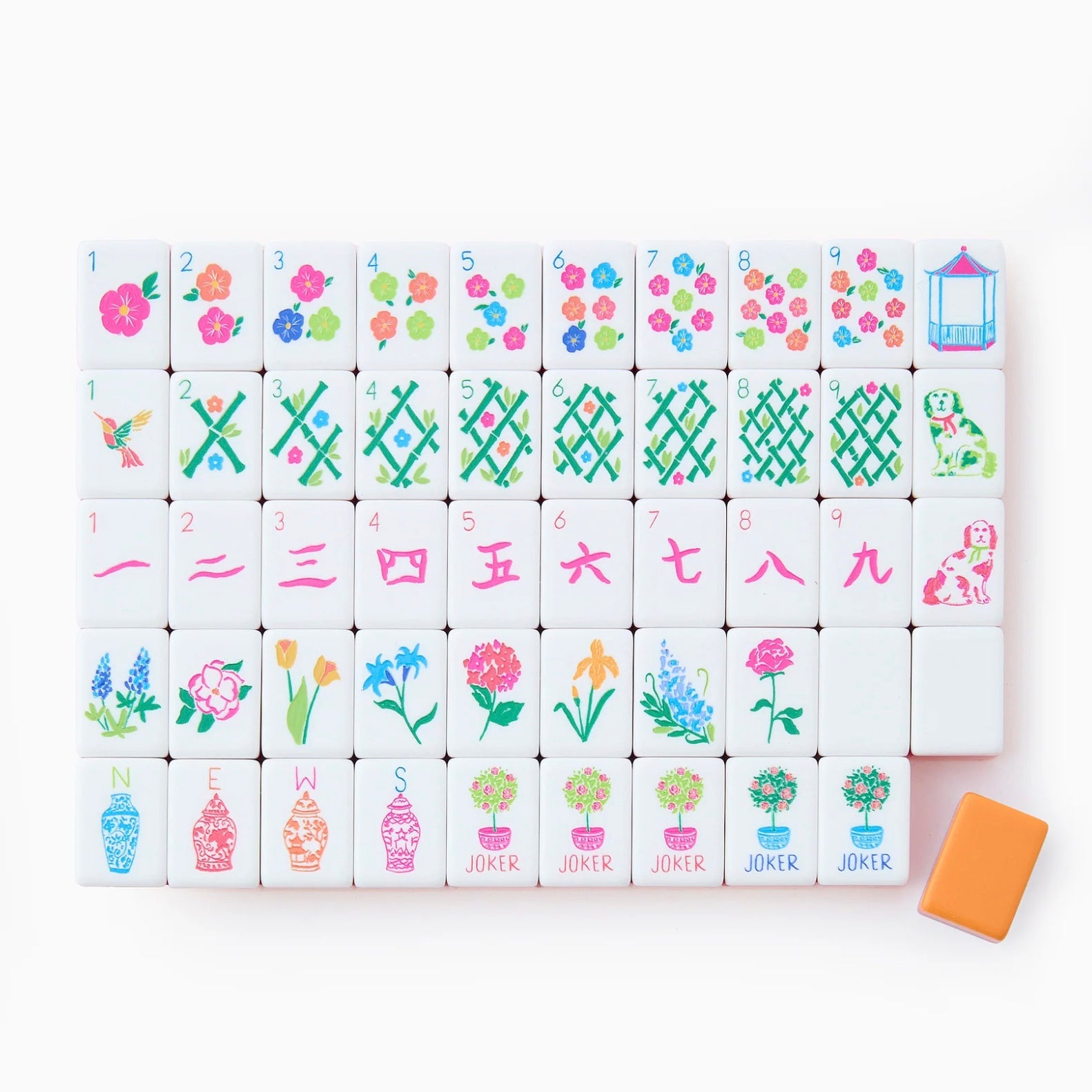 Sunset Tiles – 160 acrylic Mahjong tiles in vibrant coral, orange, and neon pink. Inspired by the colors of dusk, these tiles add bold, playful energy to every game.